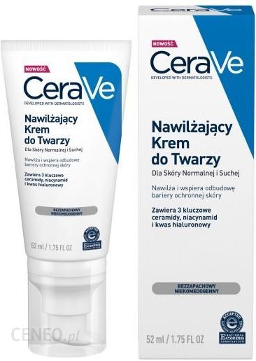 Nawilżający krem do twarzy CeraVe dla skóry normalnej i suchej, w którego skład wchodzą 3 ceramidy o kluczowym działaniu dla skóry, które w połączeniu z cholesterolem, kwasami tłuszczowymi, fitosfingozyną i kwasem hialuronowym nawilżają skórę i pomagają odbudowywać jej barierę ochronną. Uzupełnianie ceramidów polecane jest osobom narażonym na stres oraz negatywne czynniki środowiskowe, na które skóra narażona jest przez cały rok. Krem powstał we współpracy z dermatologami i szczególnie wskazany jest do pielęgnacji skóry suchej i normalnej. Może być stosowany przez całą rodzinę, również dzieci od 3 roku życia. Jego przedłużone działanie możliwe jest dzięki technologii MVE, która stopniowo uwalnia składniki aktywne w czasie.Nawilża i wspiera odbudowę bariery ochronnej skóry. Bezzapachowy, nie powoduje powstawania zaskórników.