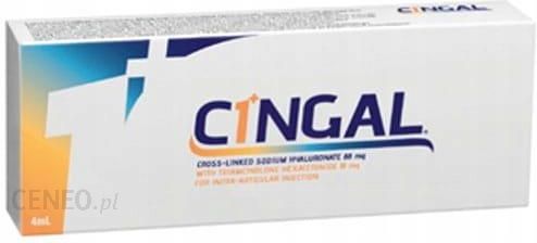 Cingal 22mg/1ml 1 ampułko-strzykawka 4ml. Cingal usieciowany kwas hialuronowy z heksacetonidem triamcynolonu jako substancją pomocniczą. Cingal jest białawym, nieprzezroczystym, jałowym, przeznaczonym do jednorazowego użytku roztworem usieciowanego żelu kwasu hialuronowego (HA) i heksacetonidu triamcynolonu (TH) – kortykosteroidu – jako substancji pomocniczej. Cingal jest substancją biokompatybilną i niepirogenną. Pomiędzy zawartym w preparacie Cingal usieciowanym kwasem hialuronowym i heksacetonidem triamcynolonu nie zachodzi fizyczna ani chemiczna interakcja, ponieważ zmikronizowane cząstki heksacetonidu triamcynolonu są zawieszone w wiskoelastycznym żelu kwasu hialuronowego i pozostają w produkcie jako osobna faza stała.