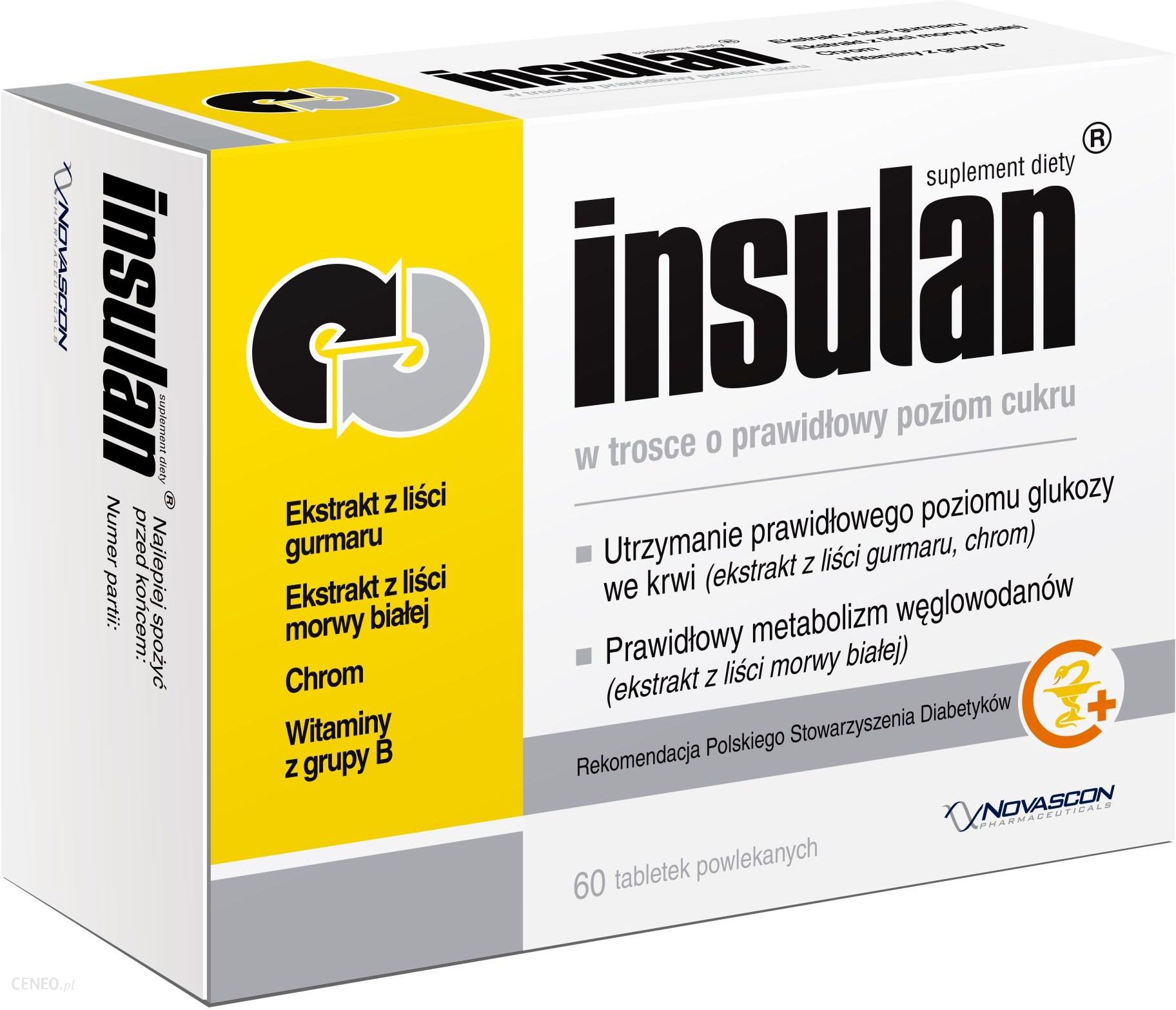 Insulan 60 tabletek powlekanych to suplement diety, którego składniki wspomagają prawidłowy metabolizm węglowodanów (ekstrakt z liści morwy białej), pomagają w utrzymaniu prawidłowego poziomu glukozy we krwi (ekstrakt z liści gurmaru i chrom) oraz przyczyniają się do zmniejszenia apetytu na słodycze (ekstrakt z liści gurmaru). Witaminy B6, B12 i kwas foliowy pomagają w utrzymaniu prawidłowego metabolizmu homocysteiny, przyczyniają się do zmniejszenia uczucia zmęczenia i znużenia oraz utrzymania prawidłowych funkcji psychologicznych. Dodatkowo witaminy B6 i B12 przyczyniają się do utrzymania prawidłowego metabolizmu energetycznego.