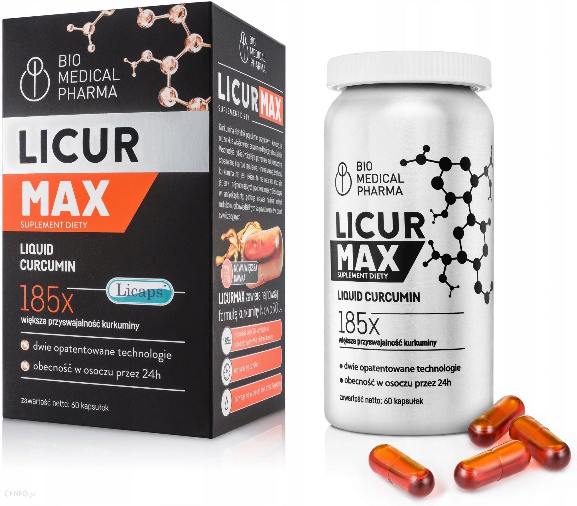 LICUR MAX dzięki zaawansowanym rozwiązaniom technologicznym jest jednym z najnowocześniejszych suplementów diety na rynku. BIODOSTĘPNOŚĆ kurkuminy Jednym z wyzwań związanych z suplementacją kurkuminy, jest jej biodostępność. Nawet przy wysokich dawkach samej kurkuminy, do organizmu wnikają jedynie śladowe ilość, a dzieje się tak dlatego, że kurkumina, ma szybki obrót metaboliczny w wątrobie i ścianach jelit. Większość́ substancji pochodzenia roślinnego, również pochodne glikozydowe polifenoli takie jak kurkumina, dobrze rozpuszcza się w wodzie. Jest jednak niedostatecznie wchłaniana ze względu na zbyt duże rozmiary cząsteczki, niezdolność́ do przenikania na zasadzie dyfuzji biernej lub też niezdolność́ do mieszania się i rozpuszczania w lipidach błon komórkowych. Opatentowana formuła kapsułek Licaps Kapsułki Licaps zostały opracowane według innowacyjnych rozwiązań farmakologicznych aby maksymalnie przyśpieszyć proces wchłaniania substancji aktywnych do organizmu i zapewnić jak najszybsze ich działanie. Wyjątkowa powłoka kapsułki rozpuszcza się już po połknięciu, uwalniając swoją zawartość w ciągu zaledwie kilku minut. Dzięki temu mamy pewność, że maksimum substancji czynnych zostanie wchłonięta przez organizm.