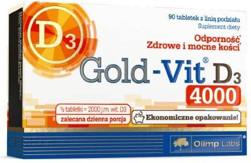 Olimp Gold-Vit D3 4000 (4000 j.m. witaminy D) 90 tabletek z linią podziału Suplement diety w postaci małych, tabletek dzielonych, zawierający wysoką porcję witaminy D (D3) w ilości aż 50 µg (2000 j.m.) w porcji dziennej (połowa tabletki). Odporność + zdrowe i mocne kości Witamina D pomaga w prawidłowym funkcjonowaniu układu odpornościowego, w utrzymaniu zdrowych kości i zębów, jak również przyczynia się do utrzymania prawidłowego poziomu wapnia we krwi. Witamina D pomaga także w prawidłowym wchłanianiu/ wykorzystywaniu wapnia i fosforu. Uwaga: zalecaną dzienną porcję stanowi ½ tabletki, co odpowiada 50 µg (2000 j.m.) witaminy D. Jedna tabletka zawiera dwie porcje dzienne (100 µg – 4000 j.m.). Nie należy spożywać więcej niż ½ tabletki dziennie. Nie należy spożywać innych preparatów zawierających witaminę D. Ze względu na wysoką zawartość witaminy D, przed zastosowaniem wskazane jest wykonanie badania 25-(OH)D we krwi oraz konsultacja wyniku badania z lekarzem lub farmaceutą. Skład Informacja żywieniowa ½ tabletki (zalecana dzienna porcja) RWS** Witamina D (D3) 50 μg (2000 j.m.) 1000% **RWS – referencyjna wartość spożycia. Składniki: substancja wypełniająca – celuloza; cholekalcyferol – witamina D, substancja przeciwzbrylająca – sole magnezowe kwasów tłuszczowych; substancja wypełniająca – sól sodowa karboksymetylocelulozy usieciowana; substancja przeciwzbrylająca – dwutlenek krzemu. Przeznaczenie: dla osób dorosłych, dzieci powyżej 11 roku życia, kobiet w ciąży i karmiących piersią, w okresie menopauzy, a także osób aktywnych fizycznie oraz osób starszych jako uzupełnienie diety w witaminę D. Zalecana dzienna porcja: osoby dorosłe i dzieci powyżej 11 roku życia ½ tabletki raz dziennie w trakcie lub po posiłku lub inaczej po konsultacji z lekarzem. Nie należy przekraczać porcji zalecanej do spożycia w ciągu dnia. Suplement diety nie może być stosowany jako substytut zróżnicowanej diety. Zalecany jest zrównoważony sposób żywienia i zdrowy tryb życia. Warunki przechowywania: przechowywać w suchych pomieszczeniach, w temperaturze pokojowej, w szczelnie zamkniętych opakowaniach. Przechowywać w sposób niedostępny dla małych dzieci. Niewykorzystaną połowę tabletki należy przechowywać w takich samych warunkach, umieścić z powrotem w otwartym blistrze i spożyć w ciągu 24 h. Opakowanie: 90 tabletek z linią podziału.