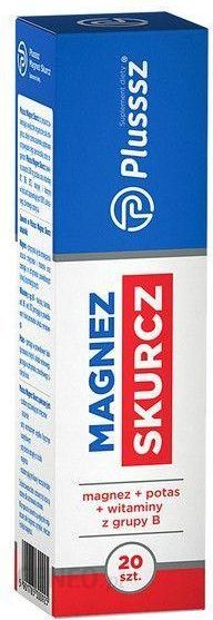 Suplement dietyPlusssz Magnez Skurcz to preparat zawierający wyłączenie organiczne sole magnezu, dzięki czemu zapewnia optymalne przyswajanie tego pierwiastka przez organizm. Plusssz Magnez Skurcz dodatkowo zawiera 300mg potasu orazkompleks witamin z grupy B, który zapewnia 100% dziennego zapotrzebowania na witaminę B1, B3, B6 i B12.Polecany dla osób: odczuwających zmęczenie i znużenie, aktywnych fizycznie i umysłowo, przy diecie ubogiej w bogate źródła magnezu.Zastosowanie: uzupełnienie diety w magnez.Zalecane spożycie: rozpuścić jedną tabletkę w szklance (200ml) chłodnej wody. Zaleca się spożywać 1 tabletkę dziennie.Składniki: regulatory kwasowości: kwas cytrynowy, wodorowęglan sodu; kompleks magnezowy (cytrynian magnezu, mleczan magnezu, diglycynian magnezu); substancja wypełniająca: sorbitol; chlorek potasu; aromaty; substancje przeciwzbrylające: poliwinylopirolidon, glikol polietylenowy; substancje słodzące: cyklaminian sodu, sacharynian sodu; witaminy (amid kwasu nikotynowego, monoazotan tiaminy, chlorowodorek pirydoksyny, cyjanokobalamina, D-biotyna); barwnik: beta karoten; proszek buraczany.1 tabletka zawiera: magnez 112,5mg (30%)*, potas 300mg (15%)*, tiamina 1,1mg (100%)*, niacyna 16mg (100%)*, witamina B6 1,4mg (100%)*, witamina B12 2,5µg (100%)*, biotyna 50µg (100%)*.* RWS – Referencyjna Wartość SpożyciaWażne wskazówki:Nie przekraczać zalecanej porcji do spożycia w ciągu dnia.Produkt nie może być stosowany jako substytut zróżnicowanej diety i zdrowego trybu życia.Zrównoważony sposób żywienia prawidłowy tryb życia jest ważny dla funkcjonowania organizmu człowieka.Preparat należy przechowywać w suchym miejscu, w temperaturze poniżej 25°C, w sposób niedostępny dla małych dzieci.Produkt może zawierać śladowe ilości laktozy (z mleka).Zawiera substancje słodzące.Producent:”Polski lek” S.Aul. Chopina 10,34-100 Wadowice.