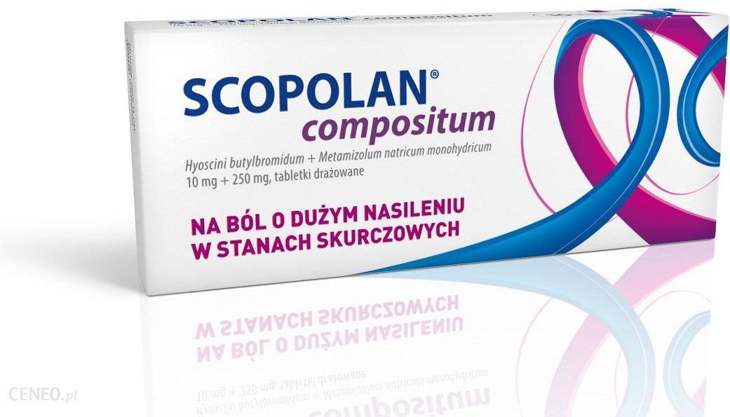 Opis Scopolan jest lekiem zawierającym butylobromek hioscyny, który znosi stany skurczowe mięśni gładkich w obrębie jamy brzusznej. Działanie rozkurczowe powoduje złagodzenie bolesnych skurczy przewodu pokarmowego, dróg żółciowych oraz układu moczowo – płciowego. Ponadto zawiera Metamizol sodowy, który działa silnie przeciwbólowo i przeciwgorączkowo, a słabiej przeciwzapalnie. Wykazuje ponadto słabe działanie spazmolityczne i uspokajające.WskazaniaKrótkotrwałe leczenie dolegliwości bólowych o dużym nasileniu w stanach skurczowych przewodu pokarmowego (np. skurcze żołądka, kolka jelitowa, zespół jelita drażliwego), dróg żółciowych (np. kolka żółciowa), układu moczowo-płciowego (np. kolka nerkowa, stany skurczowe związane z kamicą moczowodową, bolesne miesiączkowanie). Lek jest wskazany w sytuacji, gdy stosowanie innych preparatów jest przeciwwskazane lub nieskuteczne.Skład1 tabletka zawiera substancje czynne: butylobromek hioscyny (Hyoscini butylbromidum) 10mg, metamizol sodowy jednowodny (Metamizolum natricum monohydricum) 250mg, substancje pomocnicze: sacharoza, talk, skrobia ziemniaczana, guma arabska, żelatyna wieprzowa, glicerol, magnezu stearynian, tytanu dwutlenek (E171).DziałaniePrzeciwbólowe, przeciwgorączkowe, przeciwzapalne i rozkurczoweDawkowanieDoustnie. Stosować doraźnie. Dorośli: 1-2 tabl. jednorazowo, przy nasilonych bólach można podawać do 3 razy na dobę. Nie stosować u dzieci i młodzieży w wieku poniżej 18 lat. Należy poinformować pacjenta, że jeśli objawy będą się utrzymywać dłużej niż 3 dni od rozpoczęcia leczenia lub nasilą się mimo stosowania leku, pacjent powinien przerwać leczenie i skonsultować się z lekarzem.PrzeciwwskazaniaNadwrażliwość na substancje czynne lub na którąkolwiek substancję pomocniczą. Nie stosować preparatu jeśli u pacjenta występuje uczulenie na alkaloidy tropanowe (np. atropinę) i ich pochodne, nadwrażliwość na pirazolony i inne niesteroidowe leki przeciwzapalne, zmiany w obrazie morfologicznym krwi: leukopenia, granulocytopenia, niedokrwistość, wrodzony niedobór G-6-PD, ostra porfiria wątrobowa, ostra niewydolność nerek lub wątroby, jaskra z wąskim kątem przesączania, rozrost gruczołu krokowego, niedrożność porażenna jelit, zaparcia atoniczne, zwężenie przełyku, wpustu lub odźwiernika żołądka, zwężenie szyi pęcherza moczowego, tachykardia, nużliwość mięśni (myasthenia gravis), patologiczne poszerzenie jelita grubego (megacolon). Ciąża i okres karmienia piersią. Nie stosować u dzieci i młodzieży w wieku poniżej 18 lat.Przed użyciem zapoznaj się z ulotką, która zawiera wskazania, przeciwwskazania, dane dotyczące działań niepożądanych, dawkowanie oraz informacje dotyczące stosowania produktu leczniczego bądź skonsultuj się z lekarzem lub farmaceutą, gdyż każdy lek niewłaściwie stosowany zagraża Twojemu życiu lub zdrowiu.PKWIU 21.20.13.0RodzajEAN 5909990308019BLOZ_07 3117601