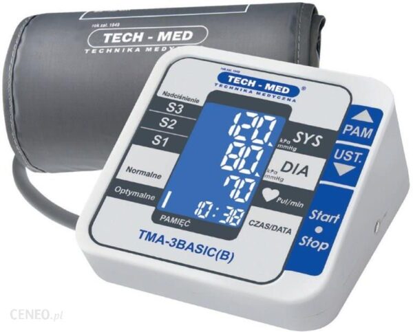 TECH-MED TMA-3 BASIC (B) to nowoczesny ciśnieniomierz elektroniczny, w którym zastosowano oscylometryczną metodę pomiaru z zastosowaniem technologii MWI (Measuring While Inflating). Ciśnieniomierz charakteryzuje się wysoką dokładnością pomiaru – równorzędną dokładności pomiarów dokonywanych metodą osłuchową za pomocą sphygmomanometrów mechanicznych przez wykwalifikowany personel medyczny. Dokładność ta została potwierdzona badaniami klinicznymi. Wykonanie dokładnego pomiaru ciśnienia jest niezwykle proste – wymaga przyciśnięcia tylko jednego przycisku. Ergonomiczny wyświetlacz LCD zapewnia łatwy odczyt wyniku pomiaru